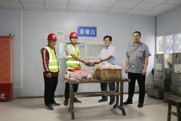 之后,劉志剛帶著月餅、豬肉等慰問品到作業(yè)班組生活區(qū)對一線工人進(jìn)行慰問,在食堂劉志剛把豬肉遞到班組長手里并囑咐他們一定要提高節(jié)日期間的伙食水平,讓堅持在現(xiàn)場施工的工人吃好,消除他們的后顧之憂。