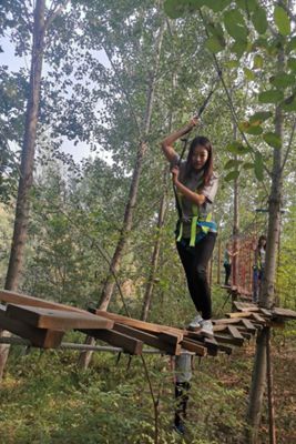 “叢林穿越”項(xiàng)目最受大家歡迎,有空中秋千、索道、走鋼絲、獨(dú)木橋、空中云梯、吊橋等一系列的拓展環(huán)節(jié)。叢林穿越過程中,劉暢作為今年新入職的職工,第一個(gè)走上了獨(dú)木橋的平臺(tái)上,只見她的雙手緊緊地抓住兩邊的繩子,目光堅(jiān)定,腳步穩(wěn)健,順利完成了第一個(gè)挑戰(zhàn)項(xiàng)目——獨(dú)木橋。隨后,來到走鋼絲的環(huán)節(jié),只見她小心翼翼試了試腳感,感覺比較安全,然后小碎步開始向前走。突然,鋼絲像秋千似的蕩起來,于是她就改變了策略,邁開大步向前走,本來晃動(dòng)挺厲害的鋼絲慢慢靜止下來,找到了最佳的方法后,還不忘向后面的同事傳授闖關(guān)秘籍,最后在她不懈的努力下闖關(guān)成功。就在大家紛紛踴躍嘗試拓展項(xiàng)目的過程中,發(fā)生了一個(gè)令人感動(dòng)的小插曲。機(jī)關(guān)后勤人員桂淑霞在闖空中云梯環(huán)節(jié)中,由于體力不支,突然她的雙腿從梯子的空隙中跌落下去,卡在梯子中,動(dòng)彈不得。正在后面闖關(guān)的財(cái)務(wù)科科長(zhǎng)宋敬凱看到了這一幕,他不顧自己的安危,飛快跑過去,幫桂淑霞把雙腿從空隙中“拔”了出來,使她脫離險(xiǎn)境。