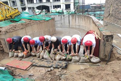 防汛演練緊貼實際。首先項目部按照預(yù)定方案和針對現(xiàn)場地形,最容易產(chǎn)生積水的車庫成為了此次防汛的重點搶險位置。在演練過程中于立功以身作則,沖在防汛最前面,帶領(lǐng)工人扛沙袋,設(shè)置警戒線,在車庫入口做好擋水墻;現(xiàn)場臨電電工接通電線,啟動移動水泵等搶險設(shè)備抽排積水;清淤小組打開雨水篦進行人工助排,快速清理路面淤泥垃圾等,搶險現(xiàn)場各項工作井然有序進行。演練過程中全體人員士氣高昂、配合默契、銜接流暢,圓滿地完成了防汛應(yīng)急演練。