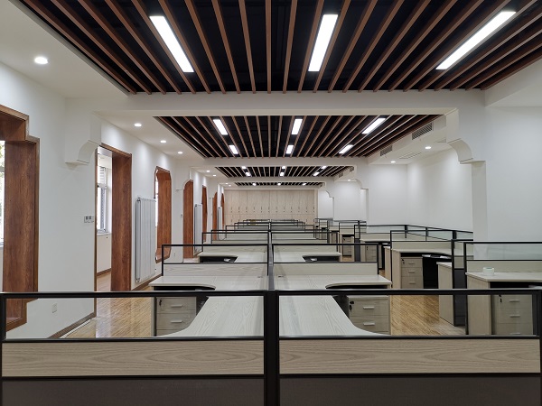 在該項目的裝飾設(shè)計中,設(shè)計院充分利用原建筑條件,在盡可能節(jié)約裝修成本的基礎(chǔ)上,將辦公環(huán)境打造成為簡約優(yōu)雅、別具一格的空間。改造區(qū)域原為多個小型辦公室,并且處于院落的南面,采光極差。設(shè)計師經(jīng)過與領(lǐng)導協(xié)商,除保留個別房間外,將剩余的幾個辦公室隔墻拆除,從而獲得了一個大而開敞的辦公區(qū),可容納36個寬敞工位,并取消此辦公區(qū)域所有的門,且將原窗戶臺面降低至距地40厘米高,最大可能的利用了自然采光。色調(diào)的選擇上,墻面大面積采用白色乳膠漆與硅藻泥,一定程度上也彌補了自然采光的不足。