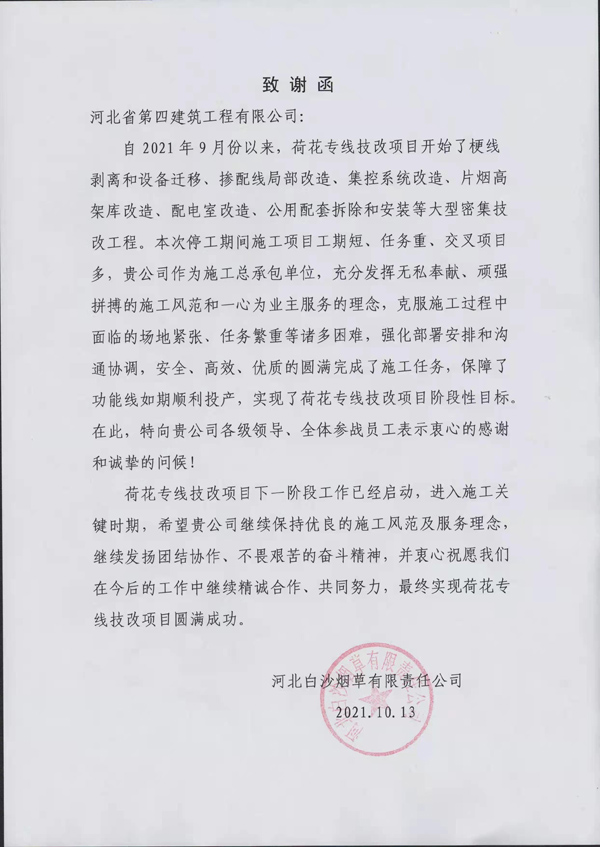 一紙致謝函,字字鼓人心!10月13日,三分公司中煙項目部收到業(yè)主河北白沙煙草有限責(zé)任公司發(fā)來的致謝函,感謝項目部克服場地緊張、任務(wù)重等諸多困難,圓滿完成施工任務(wù),實現(xiàn)了荷花專線技改項目階段性目標(biāo)。