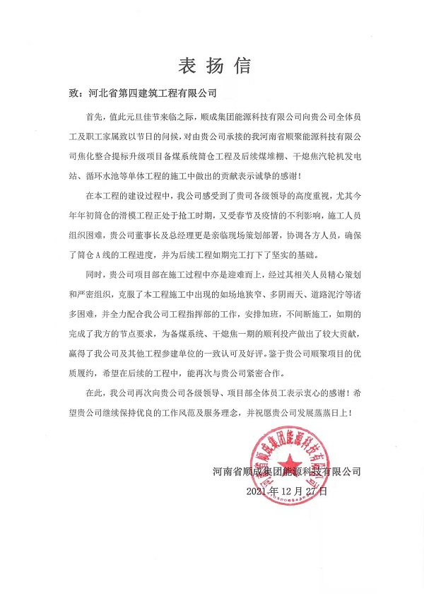 2022年元旦前夕,一封表揚信的到來讓十分公司的節(jié)日氛圍更添喜悅。2021年12月27日,十分公司河南順聚焦化項目收到來自業(yè)主方致公司的表揚信,對項目部攻堅克難爭當(dāng)先鋒、誠信履約做出表率提出表揚,同時對項目管理團隊在備煤系統(tǒng)筒倉工程及后續(xù)工程施工中做出的貢獻(xiàn)表示誠摯的感謝。