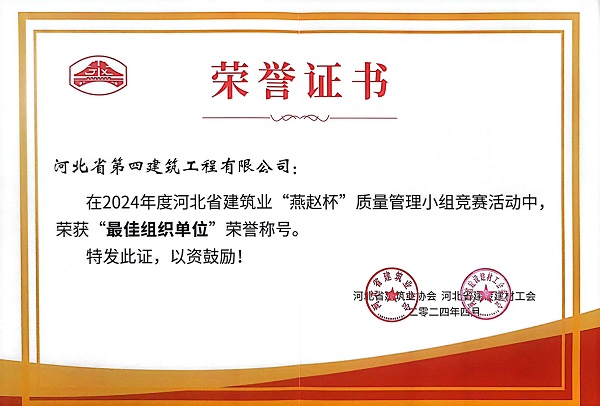 4月18日至20日,在河北省建筑業(yè)協(xié)會舉辦的2024年度河北省建筑業(yè)“燕趙杯”質(zhì)量管理小組競賽活動中,公司參賽的16項成果全部獲獎,公司獲“最佳組織單位”榮譽(yù)稱號。