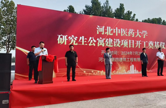 奠基儀式現(xiàn)場,挖掘機(jī)、裝載機(jī)身披大紅花整齊排列,猶如即將出征的戰(zhàn)士,工人整裝待發(fā),信心滿滿、斗志昂揚(yáng)。儀式在歡快激昂的樂曲聲中拉開序幕。主持人首先介紹了參加本次儀式的相關(guān)領(lǐng)導(dǎo)和項(xiàng)目概況。隨后,唐志強(qiáng)作為施工單位代表首先發(fā)言,“我公司有幸承接該施工任務(wù),充分體現(xiàn)了項(xiàng)目主管部門和建設(shè)單位對我們國有建筑企業(yè)的信任和支持。河北四建一定高標(biāo)準(zhǔn)、嚴(yán)要求,為項(xiàng)目順利實(shí)施提供有力保證,為業(yè)主提供滿意服務(wù),為河北中醫(yī)藥大學(xué)醫(yī)學(xué)教育的高質(zhì)量發(fā)展貢獻(xiàn)力量!”最后,學(xué)校黨委副書記孫士江表示,河北中醫(yī)藥大學(xué)研究生公寓為省政府支持骨干大學(xué)建設(shè)項(xiàng)目,希望參建各方全力以赴確保按時(shí)完工投入使用,建設(shè)“品質(zhì)工程”“一流工程”,促進(jìn)學(xué)校各項(xiàng)事業(yè)取得新成就,為經(jīng)濟(jì)強(qiáng)省、美麗河北建設(shè)作出新的更大貢獻(xiàn)!