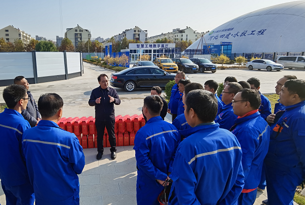 在加氯加藥車間,他關(guān)切詢問地基處理情況,了解水泥土樁養(yǎng)護及實驗報告情況,要求項目部高質(zhì)量完成施工策劃,確保各工序間的無縫銜接,用實際行動高效完成進度目標(biāo)。