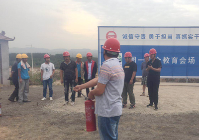 項目部即將進行墊層混凝土澆筑施工,現(xiàn)場有大量的木模板、油漆等易燃品,正值高溫季節(jié),火災(zāi)隱患較大。項目部結(jié)合現(xiàn)場實際組織了本次消防演練,演練分為消防知識培訓和火災(zāi)事故演練兩部分。演練前項目經(jīng)理李宏偉通報了溫嶺槽罐車爆炸事故造成的嚴重后果,闡明本次演練的目的和意義。隨后項目部安全員王東春對滅火常識、火災(zāi)逃生方法、滅火器如何使用等進行了講解,并演示了手提式干粉滅火器的具體使用方法,參與演練的人員親自體驗了滅火器的使用。