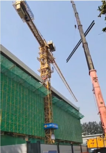 “大臂往右,慢一點(diǎn)……”塔吊下,信號(hào)工通過對(duì)講機(jī)指揮塔吊緩慢旋轉(zhuǎn)避讓。隨后,負(fù)重吊車精準(zhǔn)、平穩(wěn)地將鋼梁吊裝到施工區(qū)。