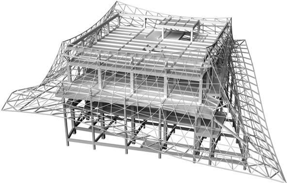 該工程表皮結(jié)構(gòu)采用圓鋼管相貫焊接的單層鋼網(wǎng)格結(jié)構(gòu),局部采用平面鋼桁架,表皮鋁板采用白色穿孔鋁板,雙曲穿孔鋁板外圈穿孔位置距邊線20mm,其余穿孔位置為不規(guī)則孔。面對外裝飾層鋼結(jié)構(gòu)造型復(fù)雜、精度要求高等挑戰(zhàn),項目部依托BIM技術(shù)構(gòu)建數(shù)字化解決方案,通過Tekla軟件精確計算桿件內(nèi)力和優(yōu)化拼裝單元,將傳統(tǒng)的二維圖紙轉(zhuǎn)化為三維可視化模型,便于更直觀地理解復(fù)雜節(jié)點和施工流程。利用Navisworks和BIMFILM軟件進行施工動畫模擬,通過三維可視化模型編排制作吊裝順序,形成吊裝三維演示動畫,優(yōu)化施工順序和工序銜接,確保施工安全、質(zhì)量,有效提高施工效率。引入智能測量技術(shù),以全站儀、電子水準儀等設(shè)備實時監(jiān)控安裝精度,形成“模擬預(yù)判+動態(tài)糾偏”的質(zhì)量保障體系。在鋼網(wǎng)架安裝前,將全站儀、電子水準儀、GPS定位系統(tǒng)采集的數(shù)據(jù)進行綜合對比分析,提高測量放線精度,通過實時數(shù)據(jù)監(jiān)控及時調(diào)整施工過程中的誤差,實現(xiàn)動態(tài)糾偏。鋼網(wǎng)架拼裝單元安裝完成后,通過實際測量采集數(shù)據(jù)與模型進行對比,修正調(diào)整施工誤差。此外,項目部通過無人機掃描技術(shù)對安裝后的鋼結(jié)構(gòu)骨架成品空間坐標(biāo)進行驗收,為后續(xù)鋁板表皮安裝提供精準數(shù)據(jù),確保建筑外觀效果與設(shè)計一致。